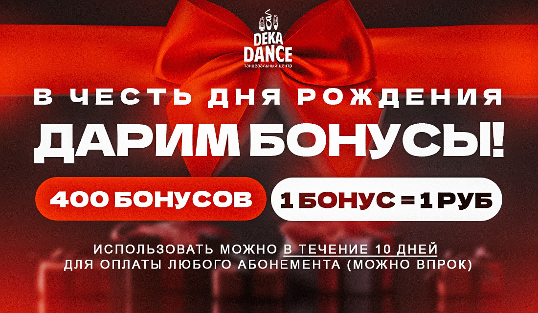В день рождения мы дарим вам 400 бонусов! Они автоматически начисляются в ваш праздник и действуют 10 дней. Отличный повод порадовать себя подарком. Если у вас уже есть действующий абонемент, вы можете приобрести новый заранее с использованием бонусов.